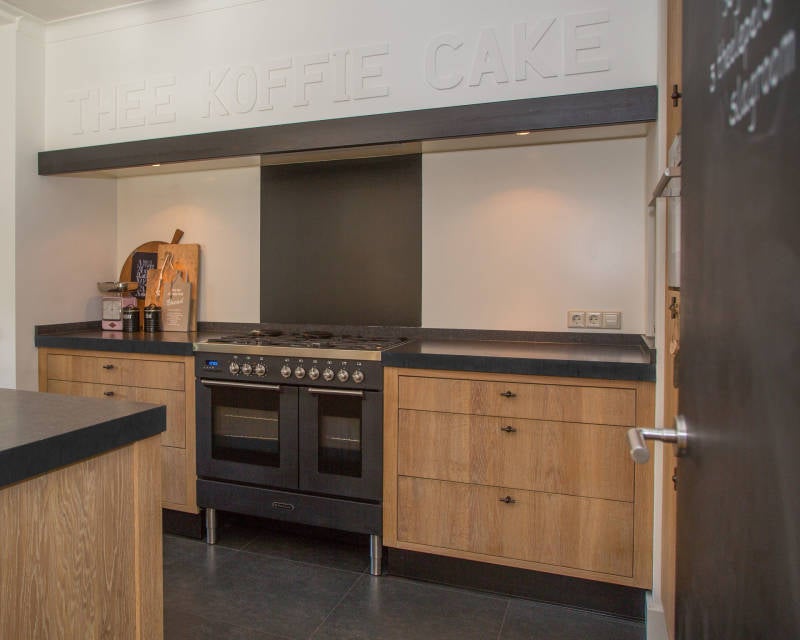 Maar de EIKEN KEUKEN kan ook een stoere industriële uitstraling krijgen door bijvoorbeeld een betonnen aanrechtblad en stoere ijzeren knoppen.