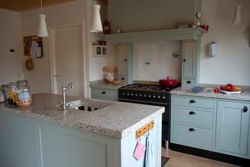 Denk hierbij aan Terrazzo aanrechtbladen en een gootsteenbak met zwart-wit tegeltjes.